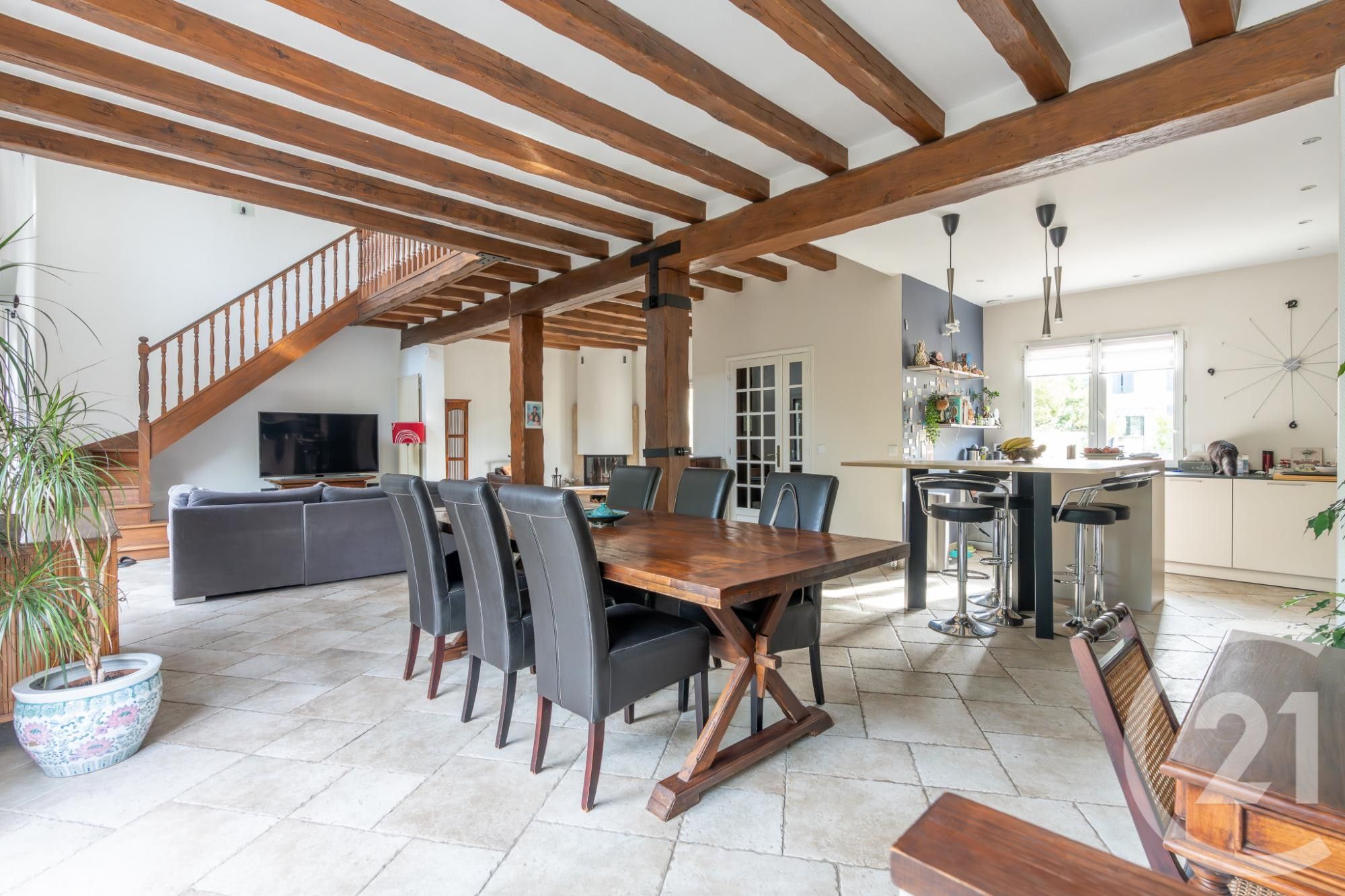 Cette maison dispose d'une pièce de vie de plus de 72m² traversante et baignée de lumière (cheminée, poutres et belle hauteur sous plafond), avec sa cuisine aménagée et équipée ouverte avec son îlot repas, donnant de plain-pied à sa terrasse exposée OUEST et son jardin bucolique attenant.